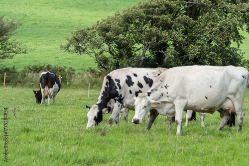 Several black and white cows graze on green grass in a field with trees in the background. This scenic farm landscape is located in West Cork.