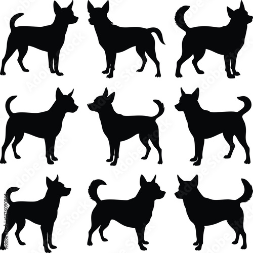 Several black silhouettes of dogs showing different poses and tail positions on a white background