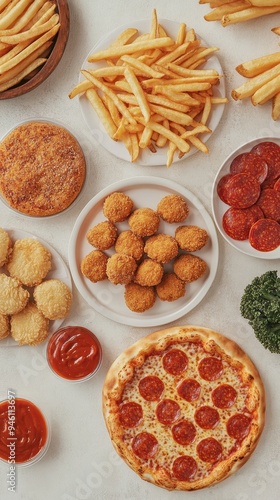 Several fast food items are arranged on a table, including pizza, fries, chicken nuggets, and various dipping sauces