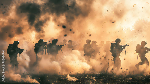 Several modern soldiers fully equipped facing the camera in a dusty and smoggy environment