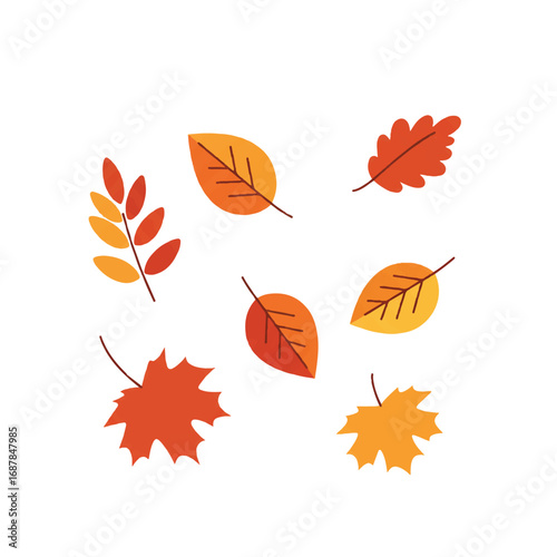 Several vibrant autumn leaves, rendered in a 2D flat vector illustration style, are gracefully falling against a clean white background, showcasing minimalist solid colors and crisp lines.