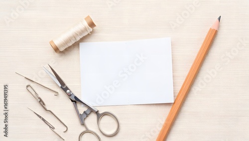 Sewing tools and pencil on textured surface thread scissors