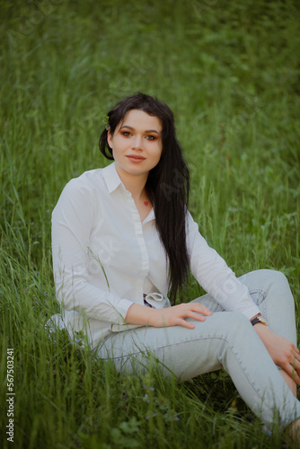 Sexy brunette sits on the grass in a summer park in a white blouse and jeans