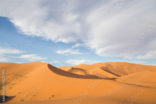 Shadow and light over the desert sand dune landscape of Erg Chebbi near the village of Merzouga in southeastern Morocco.