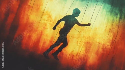 Shadowy silhouette of a man running through a glowing fiery landscape with vivid orange and yellow colors, intertwined with strings of glowing wire