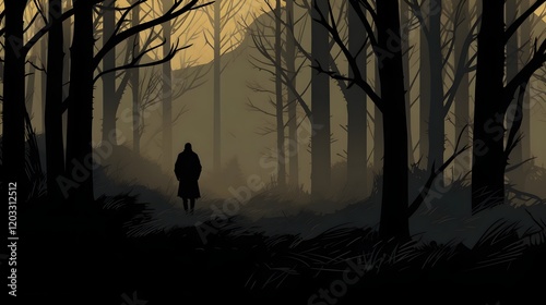 Shadowy Sinister Devil Lurking Behind the Trees in a Dark Foreboding Forest Landscape with an Ominous Supernatural Atmosphere Mysterious and Haunting Fantasy Scene