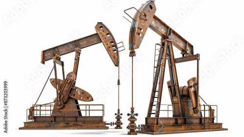 Sharp and highly detailed 32k UHD photo of pumpjacks, isolated on a white background, utilizing focus stacking for maximum clarity and detail