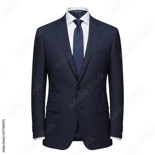 Sharp navy blue two button suit with crisp white shirt and dark blue tie exudes professional confidence for any business occasion
