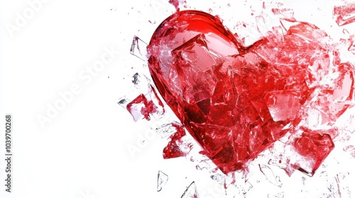 Shattered ice heart symbolizing love's fragility and beauty, set against a white background that enhances the vibrant red color