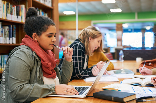 She gives it her all when it comes to studying. Shot of a focused young female student working on her laptop and studying inside of a library.