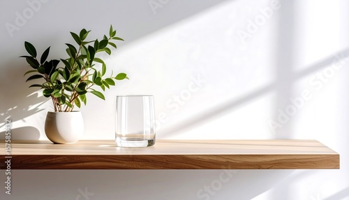 Shelf with plants and glass, sunlit