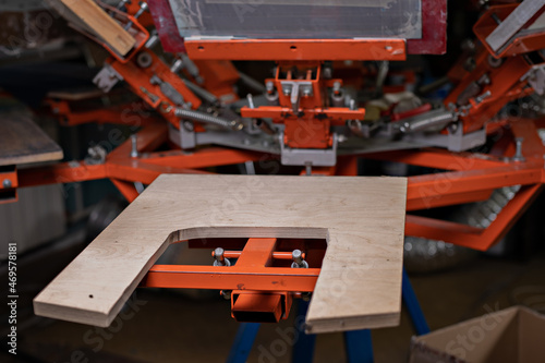 shelve of the print screening apparatus for printing on pants by silk screen. printing images on clothes in a design studio. serigraphy production