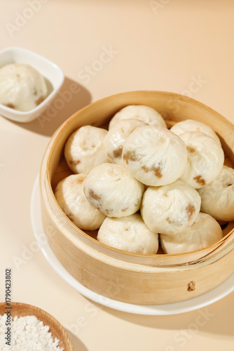 Shengzhou Xiaolongbao Chinese Soup Dumplings with Meat Filling in Bamboo Steamer Traditional Cuisine