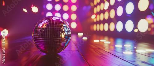 Shining disco ball reflecting colorful lights in a vibrant, retro-themed dance club full of energy and sparkle.