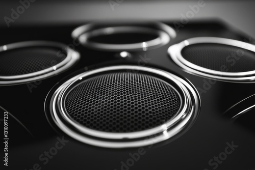 Shiny black audio speakers with honeycomb textured metal grilles create immersive sound experience