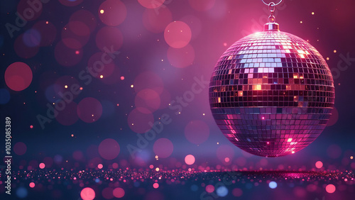 Shiny disco ball on color background with blurred lights, space for text. Bokeh effect.