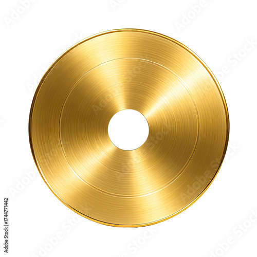 Shiny gold disc with a hole, circular grooves, centered on black