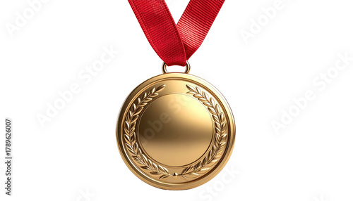 Shiny gold medal hung on red ribbon, set on black background