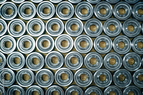Shiny metal bearings aligned in rows showing precision engineering and manufacturing processes