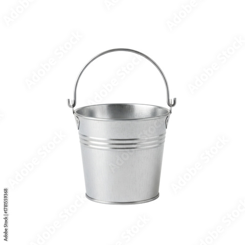 Shiny metal bucket with handle, isolated on a solid surface, offering ample storage capacity