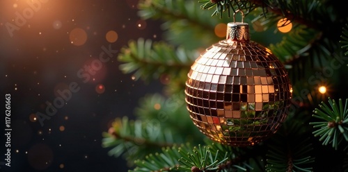 Shiny reflective disco ball on fir tree branch, ornaments, glow, shiny