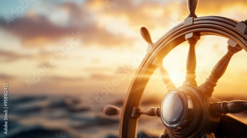 Ship helm in 3D, positioned against a brilliant sunset, rays of light illuminating the details of the wheel, representing guidance and exploration