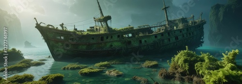 Shipwreck on the seabed covered in green algae and seaweed, algae, underwater wreckage