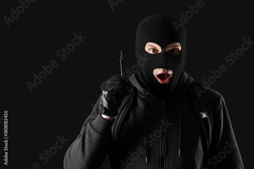 Shocked male thief with master key on black background
