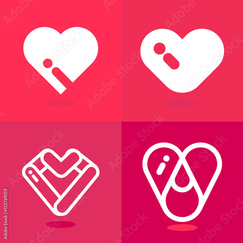 4 styles of white heart with exclamation mark as a shadow on the different tone of shocking pink.