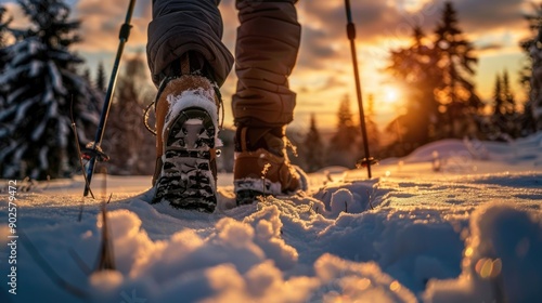 Shoes of a hiker in the snow with hiking sticks, forest, winter, sunset
