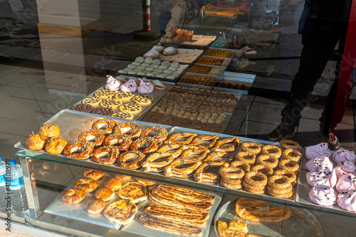 Shop window with pastry shop pastries through glass