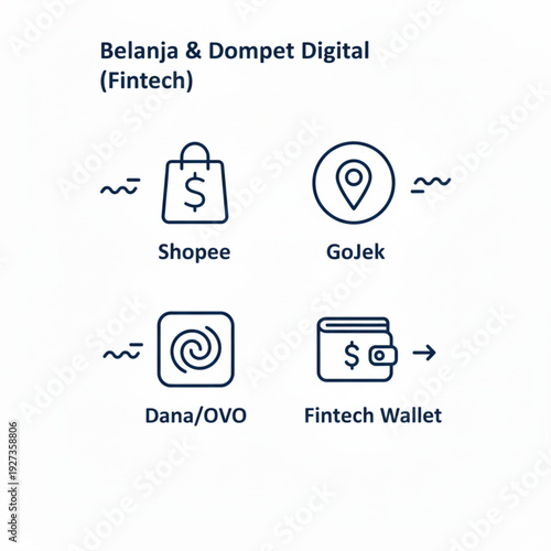 Shopping and Fintech Digital Wallet Outline Icons