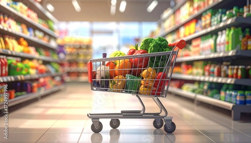 Shopping cart in supermarket aisle with groceries and red trolley