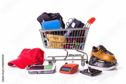 Shopping cart with various items and electronics.