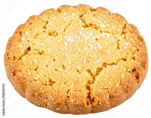 Shortbread cookie showered with fine sugar grains, sitting pristinely against transparent backdrop
