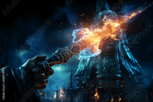 shot of a dark murky water cannon blast spell being launched by a magic wand. AI generative