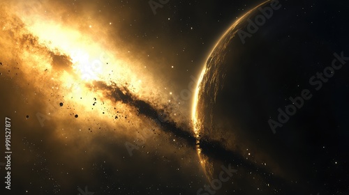 Show a distant star system being partially obscured by a massive cosmic body, with dramatic shadow play and light diffusion.