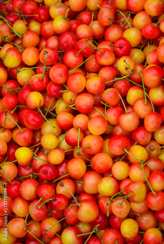 Showcase with fresh sweet cherries