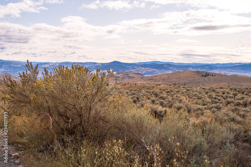 Shrub during sunset in Lac Du Bois Grasslands Protected Area near Kamloops, BC, canada. Rural pasture and grazing lands, mountains in the background, vast open space.