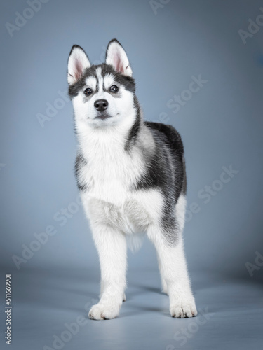Siberian husky puppy standing in a photo studio