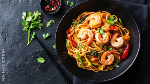 Sichuan-style noodles with shrimp, vegetables, and a dark sauce, served in a bowl on a black background