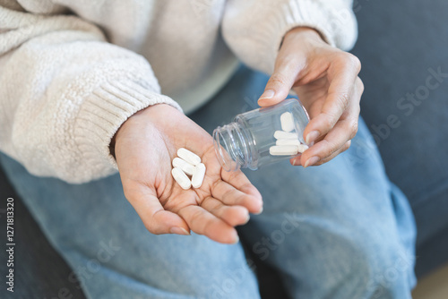 Sick asian young woman, girl holding tablet pill on hand pouring drug from medication bottle, painkiller medicine from stomach pain, head ache, pain for treatment, take drug or vitamin, health care.