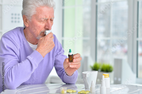 Sick elderly man taking medicine