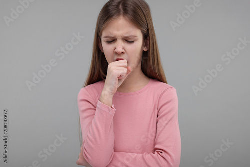 Sick girl coughing on gray background. Cold symptoms