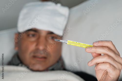 Sick man lying in bed checking his temperature with a thermometer. Selective focus