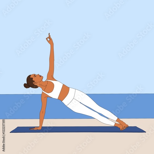 Side Plank Pose / Vasisthasana. Beautiful woman practicing yoga asana exercise on mat in nature on beach. The cartoon illustration of human, activity, seaside background.