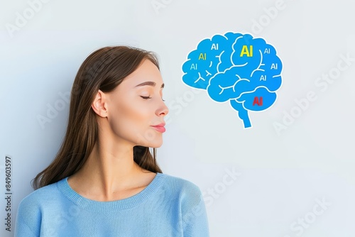 Side profile of a woman with AI brain illustration, representing artificial intelligence, cognitive science, and neural networks in a creative conceptual design.