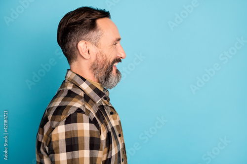 Side profile photo portrait of man smiling looking empty space in plaid shirt isolated on bright blue color background