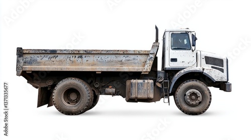 Side View of a Rusty Dump Truck on a White Background