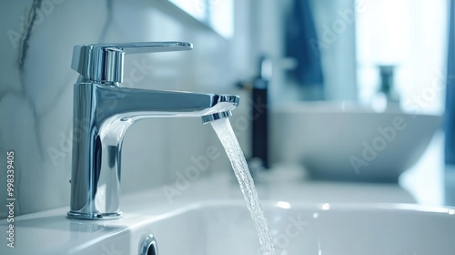 Side view of a tap water faucet with flowing water featuring a blurred bathroom backdrop